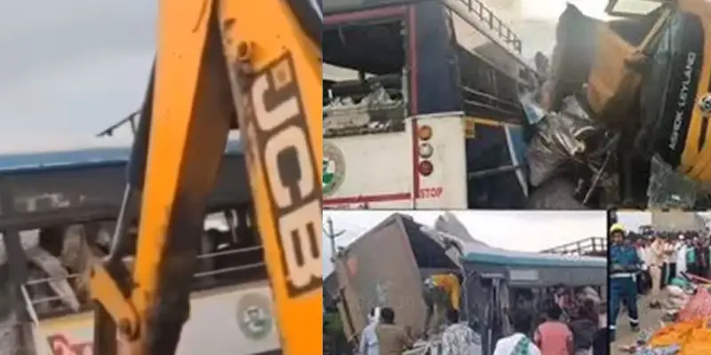 - சம்பவத்தின்போது ஜல்லி ஏற்றி வந்த டிப்பர் லாரி, ஹைதராபாத் நோக்கி சென்ற அரசு பேருந்துடன் மோதி கட்டுப்பாட்டை இழந்தது. அதிர்ச்சியூட்டும் வகையில், லாரி நேரடியாக பேருந்தின் மீது கவிழ்ந்தது. இந்த தாக்குதலில் பேருந்தின் முன்பகுதி முற்றிலும் சிதைந்து நசுங்கியது.