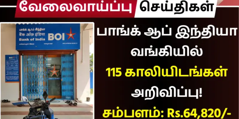 நாட்டின் முன்னணி பொதுத்துறை வங்கிகளில் ஒன்றான பேங்க் ஆஃப் இந்தியா, மும்பையை தலைமையிடமாகக் கொண்டு செயல்படுகிறது. பல ஆயிரம் கிளைகளுடன் செயல்படும் இந்த வங்கியில் தற்போது 115 காலிப்பணியிடங்கள் நிரப்பப்படுகின்றன. பல்வேறு ஐடி தொடர்பான முக்கிய பதவிகளுக்கு இந்த வேலை வாய்ப்பு வழங்கப்படுகிறது.