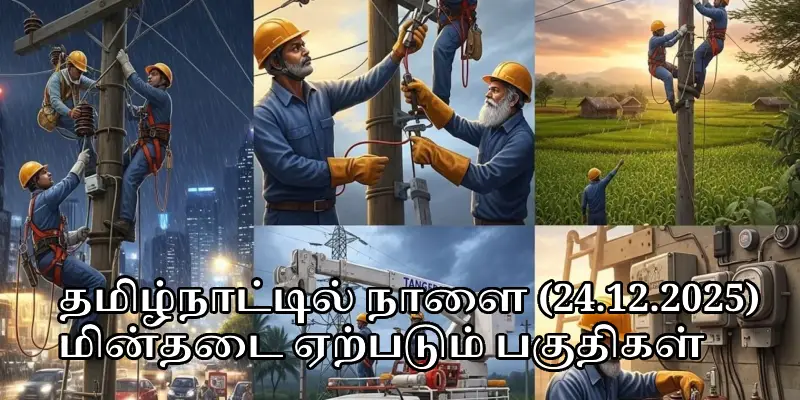 தமிழ்நாட்டில் நாளை (24.12.2025) புதன்கிழமை நடைபெற உள்ள மின்தடை தொடர்பான அறிவிப்பு வெளியிடப்பட்டுள்ளது. தமிழ்நாடு மின் உற்பத்தி மற்றும் பகிர்மான கழகம் (TANGEDCO) சார்பில், சீரான மற்றும் தடையற்ற மின்விநியோகத்தை உறுதி செய்ய துணை மின் நிலையங்களில் பராமரிப்பு பணிகள் மேற்கொள்ளப்பட உள்ளன.